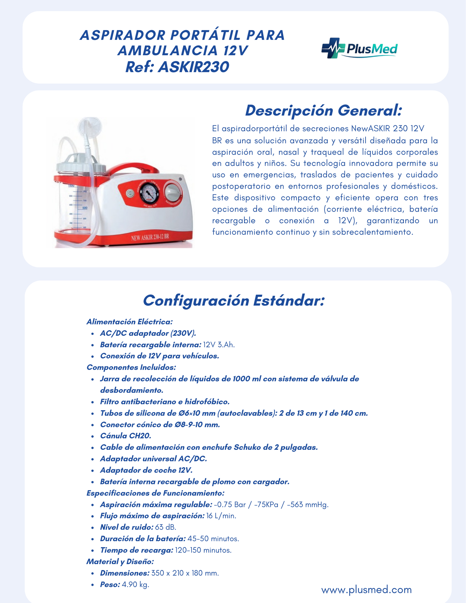 El Aspirador portátil de secreciones New ASKIR 230 12V BR es un aspirador médico para aspiración oral, nasal y traqueal de líquidos corporales en adultos y niños. Diseñado para emergencias, ambulancias, traslados de pacientes, hospitales y atención domiciliaria, ofrece un formato compacto y confiable para mantener las vías respiratorias despejadas en situaciones críticas y en terapia postoperatoria.